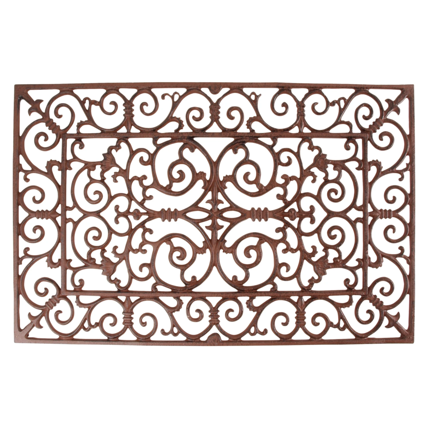 Deze rechthoekige gietijzeren deurmat zorgt voor een klassieke entree. De mat heeft een Victoriaans patroon met sierlijke krullen en is per stuk met de hand gegoten volgens eeuwenoud vakmanschap en traditie.