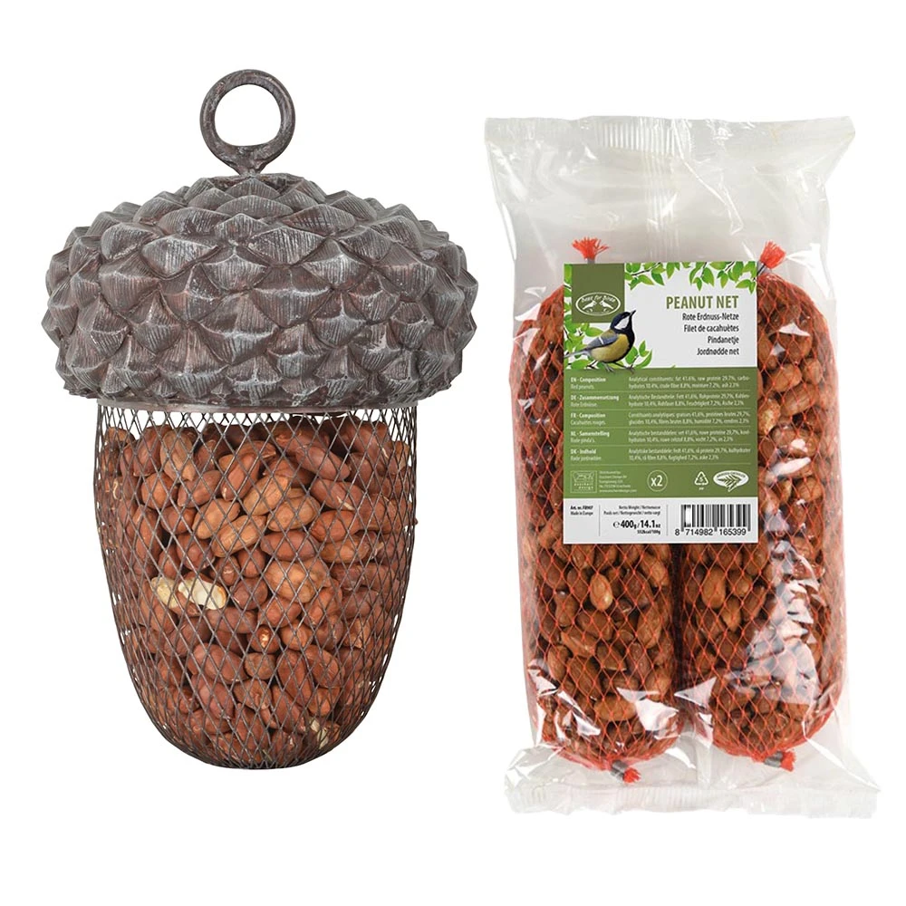 Normaal zijn eikels voedsel voor vogels en eekhoorns. Nu biedt deze eikel voederhanger juist plaats voor voer. De voederhanger kan voorzien worden van bijv. pinda’s en noten. Door het los draaien van de ophangring kan het deksel eraf gehaald worden en kan het onderste gedeelte eenvoudig gevuld worden met voer. Het voer krijgt u er in deze set bij (Â Set van 2 pindanetjes).