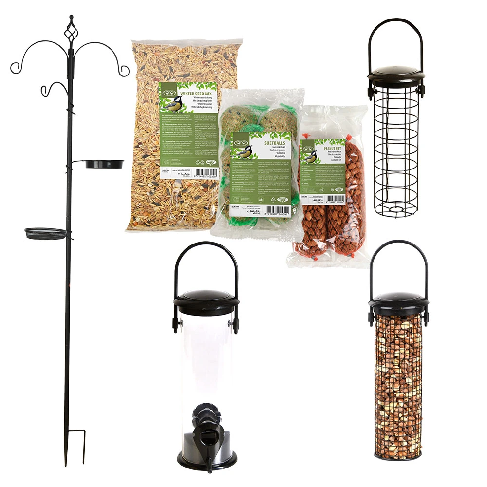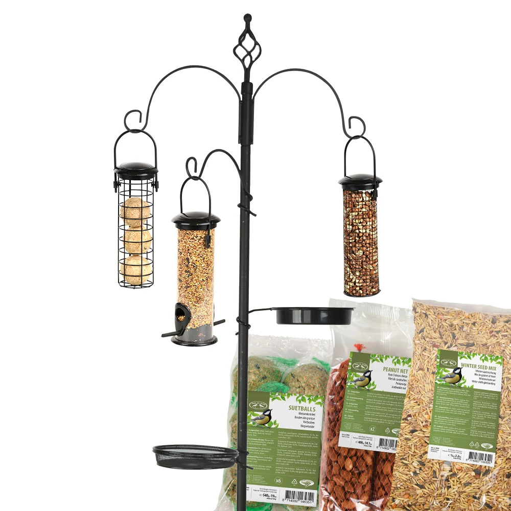 Het ultieme alles-in-een voeder-, water- en badstation voor tuinvogels. Dit praktische en decoratieve station is eenvoudig in elkaar te zetten en is ideaal voor in elke tuin. Aan de verschillende haken kunnen diverse voederartikelen worden opgehangen. Daarnaast kunnen de bijgeleverde schalen gevuld worden met water of zaad. In deze set worden 3Â voederhuisjes meegeleverd uit dezelfde serie ‘Plastic’. De voederhuisjes zijn stuk voor stuk gemakkelijk los te koppelen en te vullen met voer. In deze set ontvangt u tevens 2 pakketten met vogelvoer.Â