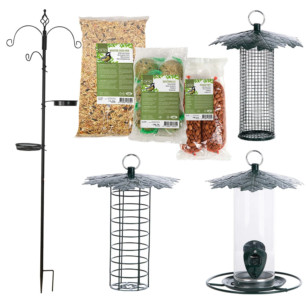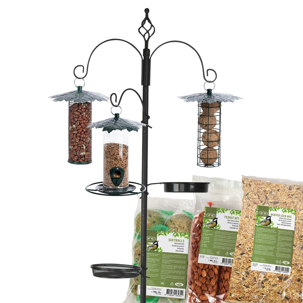 Het ultieme alles-in-een voeder-, water- en badstation voor tuinvogels. Dit praktische en decoratieve station is eenvoudig in elkaar te zetten en is ideaal voor in elke tuin. Aan de verschillende haken kunnen diverse voederartikelen worden opgehangen. Daarnaast kunnen de bijgeleverde schalen gevuld worden met water of zaad. In deze set worden 3Â voederhuisjes meegeleverd uit dezelfde serie ‘Met bladerdak’. De voederhuisjes zijn stuk voor stuk gemakkelijk los te koppelen en te vullen met voer. In deze set ontvangt u tevens 2 pakketten met vogelvoer.Â