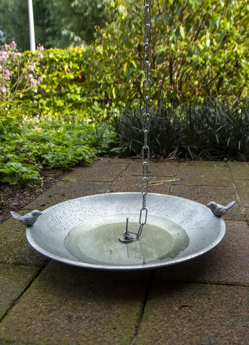 Deze decoratieve en functionele regenketting is voorzien van een vogelbad en kan aan de dakgoot worden bevestigd.