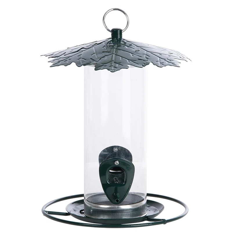 Deze voedersilo met bladerdak is gemakkelijk (na) te vullen. Door de ring los te draaien kan het deksel verwijderd worden.