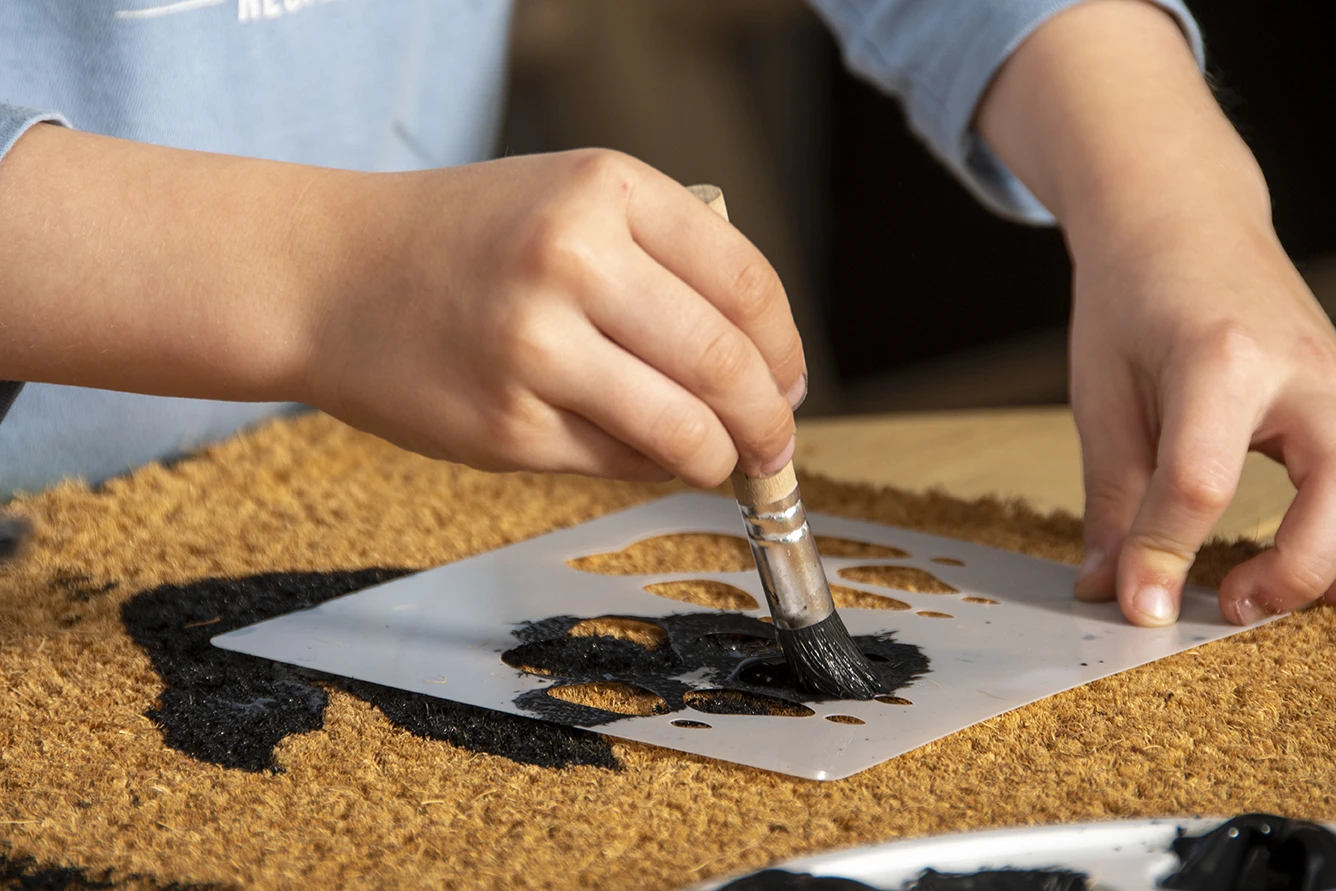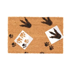 Fleur de entree op met deze kokosmat die u zelf kunt voorzien van dierensporen! U kunt met de meegeleverde vormen, verf en de kwast de mat decoreren. De sterke kokosvezels zijn ideaal om de zolen van schoenen en laarzen schoon te maken. De mat blijft op zijn plaats dankzij de pvc-rug waardoor u veilig uw schoenen kunt vegen.
