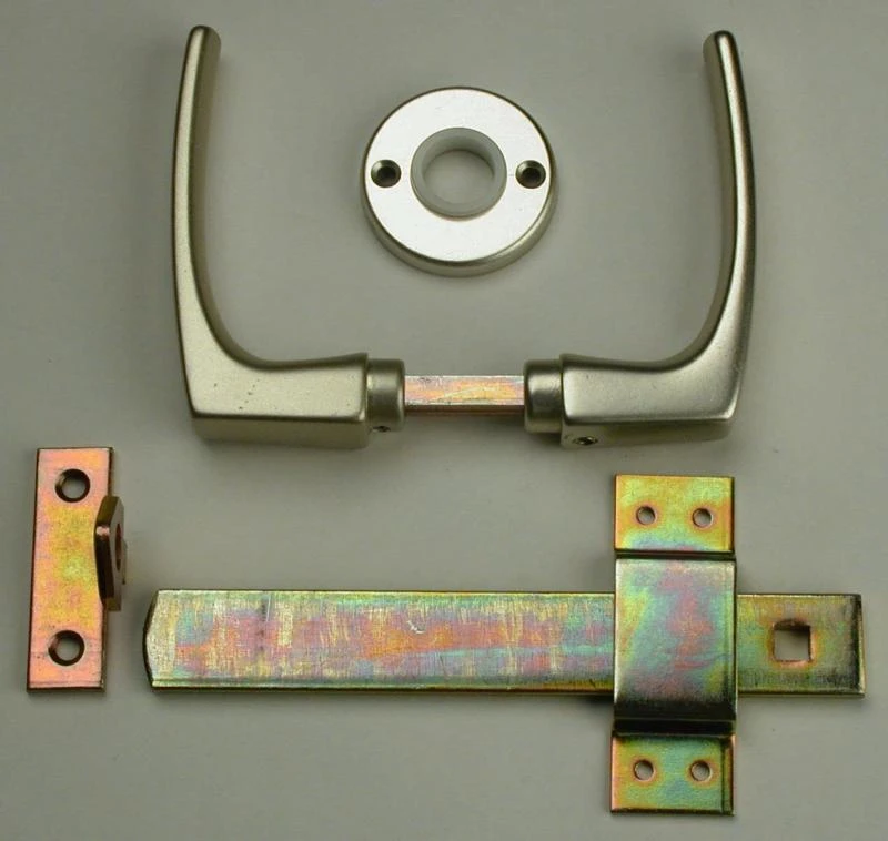 Set bestaande uit: 1 paar aluminium deurkrukken en 1 plaatneus, staal, geel gepassiveerd.In zb-verpakking.